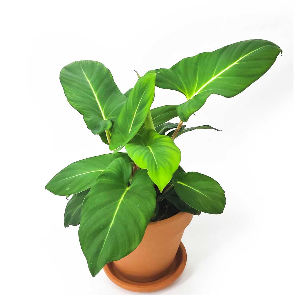Adelomena crinipes, beeindruckt mit matten, olivgrünen Blättern und leuchtend gelben Mittelrippen. Junge Blätter sind länglich, adulte Blätter werden herzförmiger. Die Pflanze wächst anfangs eher kompakt und buschig, mit der Zeit werden die Blattstiele länger und Blätter größer. Sie wächst jedoch weiterhin buschig und nicht kletternd, wie Philodendron Arten.