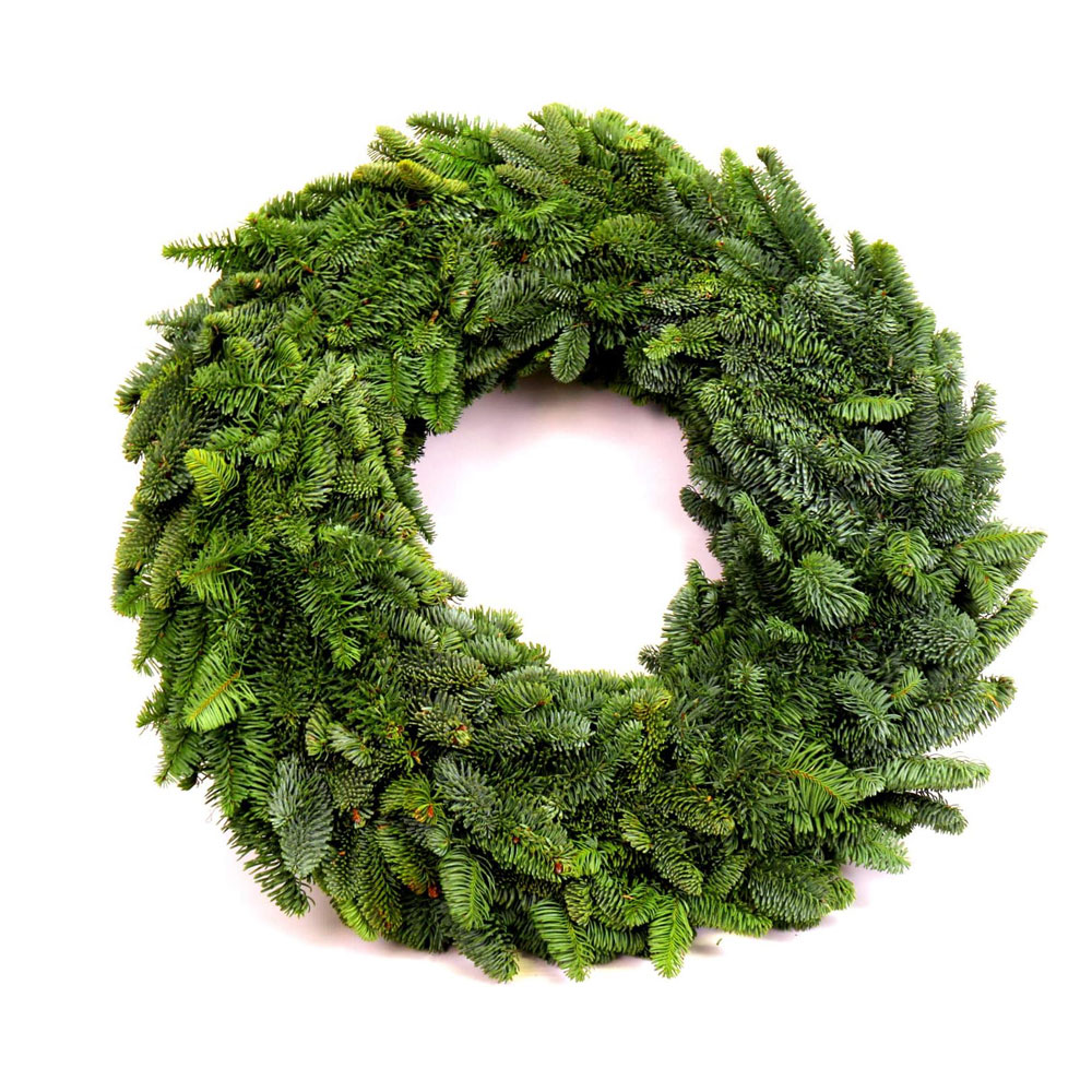 Dieser klassische dicht gebundene Kranz aus Nordmanntanne wurde meisterlich per Hand gebunden. Unter dem frischen Wintergrün befindet sich ein Strohreifen. So können Kerzenstumpen wunderbar mit Draht oder Kerzenhalter-Steckern darin befestigt werden.