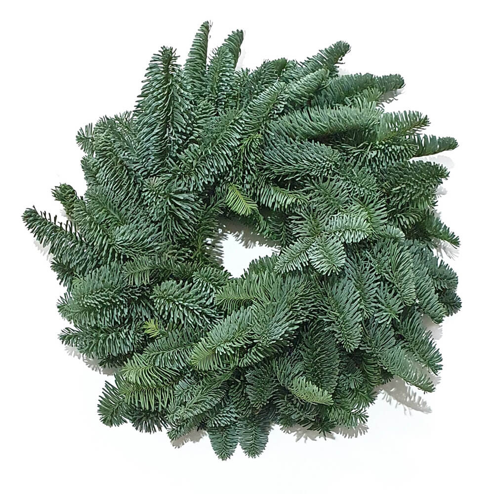 Dieser klassische dicht gebundene Kranz aus rieselarmer Nobilistanne wurde meisterlich per Hand gebunden. Unter dem frischen Wintergrün befindet sich ein Strohreifen. So können Kerzenstumpen wunderbar mit Draht oder Kerzenhalter-Steckern darin befestigt werden.