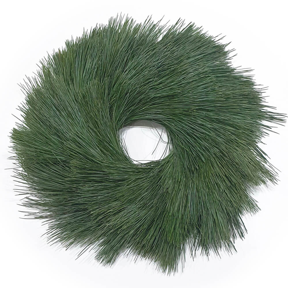Dieser klassische dicht gebundene Kranz aus eleganter, haltbarer Seidenföhre wurde meisterlich per Hand gebunden. Unter dem frischen Wintergrün befindet sich ein Strohreifen. So können Kerzenstumpen wunderbar mit Draht oder Kerzenhalter-Steckern darin befestigt werden.