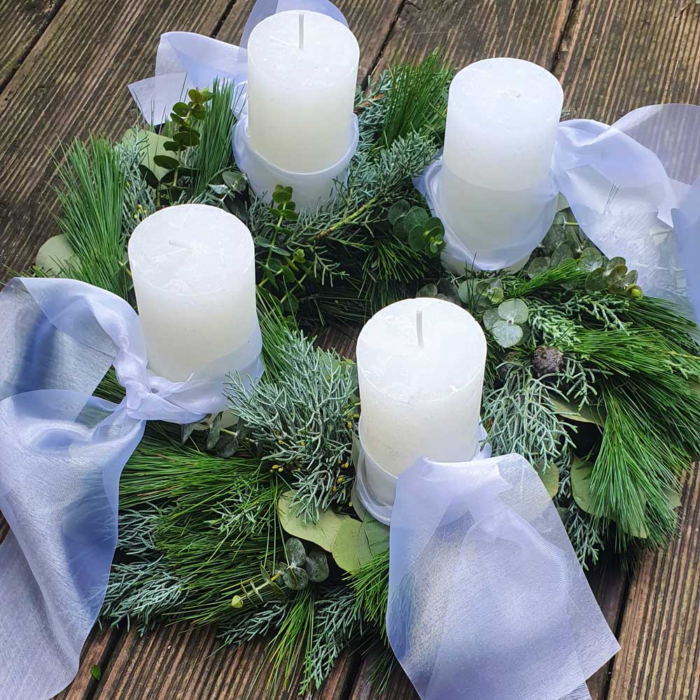 Jeder Kranz wird erst nach Bestelleingang gebunden und macht sich besonders frisch auf den Weg zu dir. Für eine längere Haltbarkeit empfehlen wir, den Kranz wenn möglich bis zum ersten Advent im Freien (regengeschützt) oder in einem kühlen Raum aufzubewahren. Bitte beachte: Der Kranz wurde mit Draht gebunden – lege ihn daher auf ein Teller oder eine weihnachtliche Unterlage, da sonst Kratzspuren entstehen können.