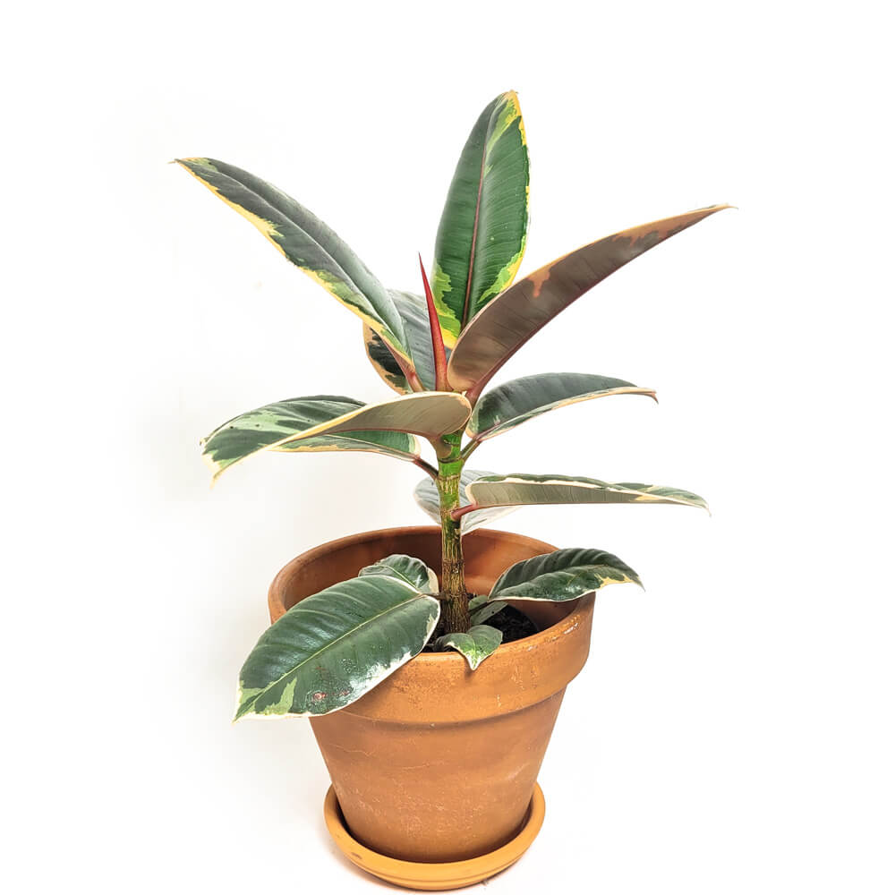 Gummibäume sind Zimmerpflanzenklassiker. Diese Sorte Ficus elastica Belize, mit ihren rosa-grün gemusterten Blättern, ist besonders hübsch. In der Natur sind sie ursprünglich in Ostindien und Indonesien zu finden. Mittlerweile sind sie aber auch in mediterranen Gegenden heimisch. Sie können dort zu riesigen Bäumen wachsen. 20 - 25 m hoch. Im Zimmer erreicht er auch Zimmerhöhe. Anfangs wächst er noch einstämmig, mit der Zeit verzweigt er sich. Wie alle Gummibäume, sondert er bei Verletzung ein Sekret ab, den Milchsaft. Dieser ist latexhaltig und wird auch zur Naturkautschuk Gewinnung verwendet. Vermeiden Sie direkten Kontakt mit dieser Flüssigkeit, da sie reizen oder Allergien hervorrufen kann. Stellen Sie die Pflanze nicht häufig um oder drehen Sie sie nicht laufend, da dies zu Blattabfall führen kann.