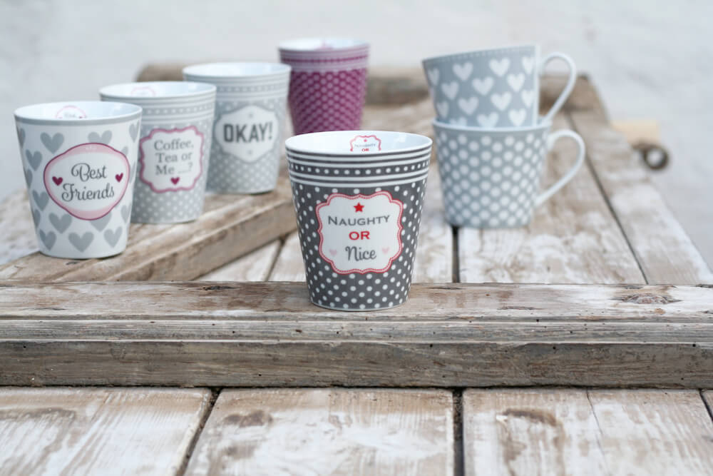 Diese tolle henkellose Tasse ist in den Farben Dunkelgrau, Weiß und Rot im trendigen Pünktchendesign gestaltet und mit der Aufschrift: Naughty or Nice? verziert.