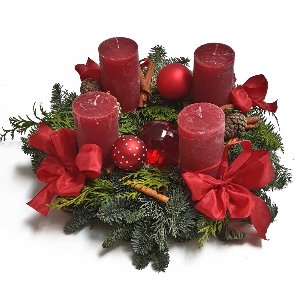Du liebst es elegant und klassisch. Dann ist dieser Adventskranz genau richtig für dich. Handgebunden, mit verschiedenem frischen Wintergrün (Nobilis Tanne, Koniferen, Wacholder, ...) darauf werden vier rote Kerzenstumpen befestigt. Jede Kerze ist qualitativ hochwertig und farblich durchgefärbt.